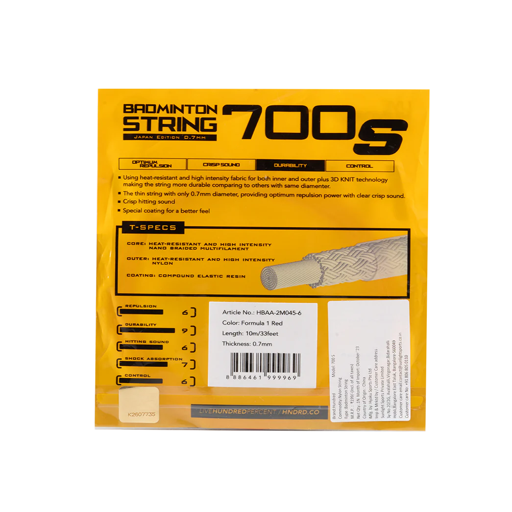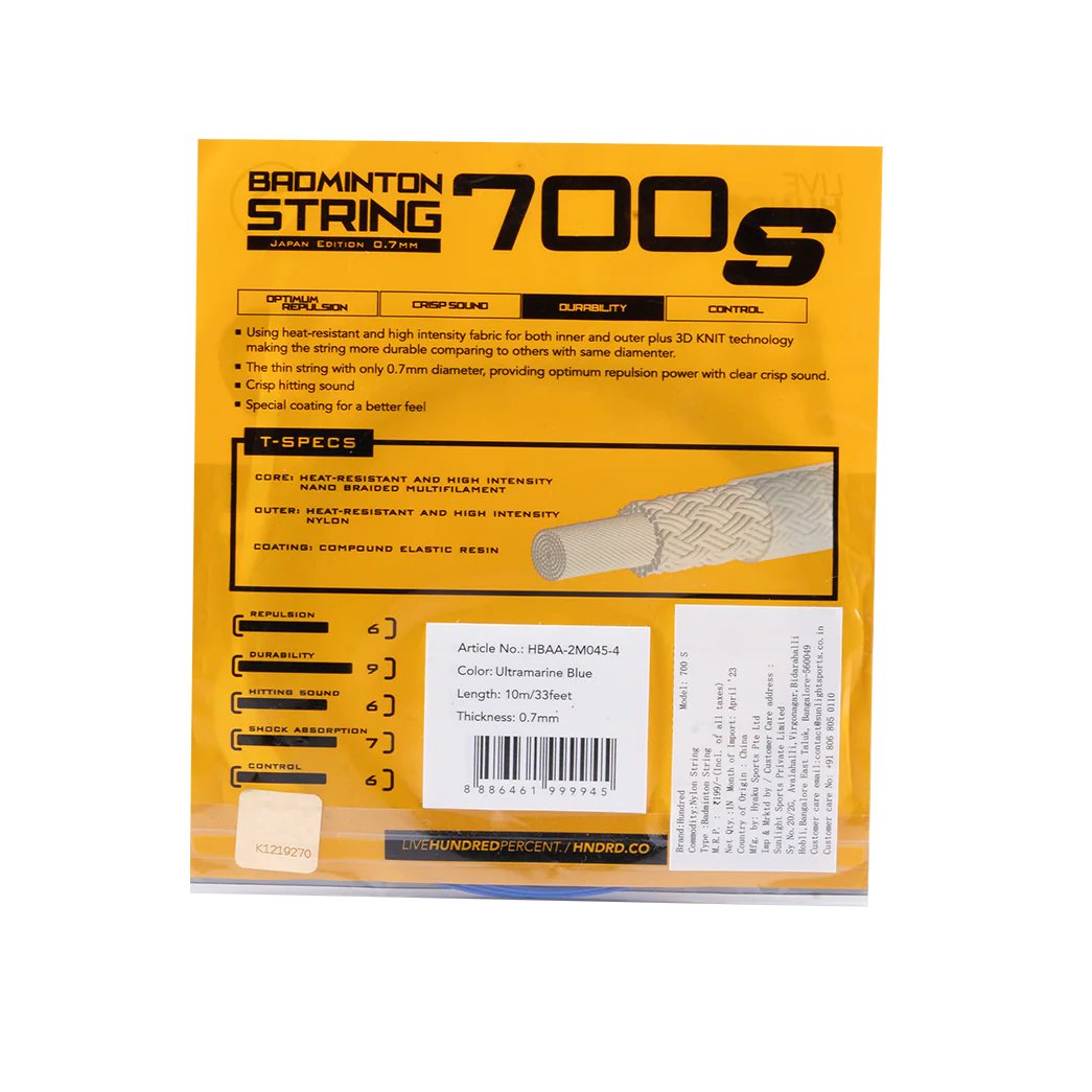 نقدم لكم خيط مضرب تنس الريشة 700S من هاندرد، دليل على متانة أدائه. بقطر 0.7 مم، يُولي هذا الخيط أهمية قصوى للمتانة، مما يجعله خيارًا مثاليًا لمن يُقدّرون طول العمر. مصنوع من مواد مقاومة للحرارة ومزوّد بتقنية 3D KNIT، يوفر هذا الخيط مقاومة استثنائية لظروف التآكل والتلف في اللعبة. كما يُضفي الطلاء الخاص عليه متانة وقوة استثنائيتين.
