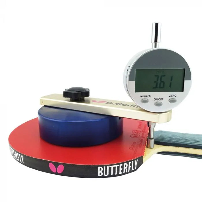 بعد عصر الغراء السريع، أصبح تحديد السُمك الدقيق للمطاط مسألةً حساسةً للاعبين والمدربين، وخاصةً للحكام. بفضل هذا الجهاز، يُمكن إجراء قياس دقيق. يأتي الجهاز مع تعليمات الاستخدام وحافظة تخزين.